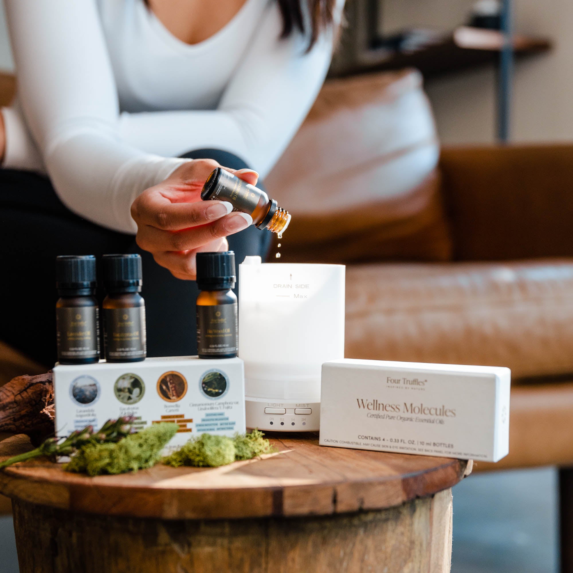 Indulge in the ultimate home wellness experience with our curated Wellness Molecules Essential Oil Set and Home Wellness Ultrasonic Diffuser. Elevate your senses with the heart of Four Truffles fragrances – four certified organic oils designed to enhance both your physical and emotional well-being. Immerse your space in tranquility as our whisper-quiet diffuser preserves the purity of each molecule, transforming your surroundings into a haven of serenity. Elevate your self-care routine and embrace the perfect blend of nature and sophistication with this exclusive duo.